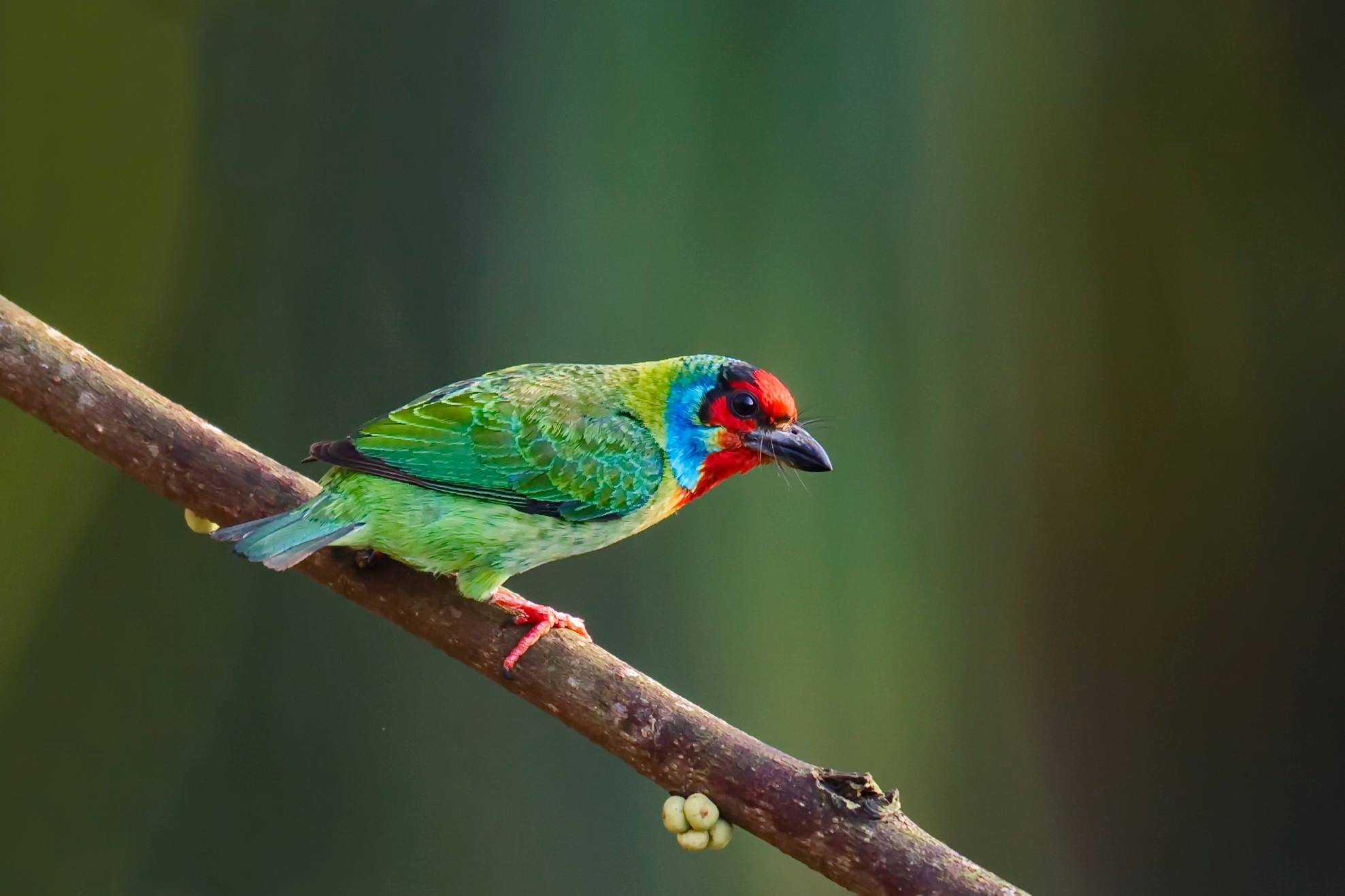 Le Barbu Géant (Psilopogon virens) est le plus grand de toutes les espèces de barbets. Le nom anglais “Barbet” est dérivé du mot français “barbe” aui fait référence aux poils qui frangent son lourd bec.